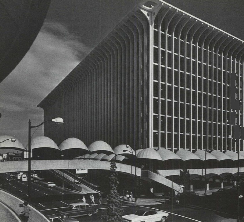 The Parkade’s futuristic design incorporated several new ideas for parking structures. The skywalks that circle the structure on the second level with eight businesses were the first found on a parking center with a roof along with yellow awnings which were a realistic and sensible solution given the climate of the region. The latest in modern technology was used at the time to create an efficient and pleasant environment for pedestrians with striking colors and many attractive shops.